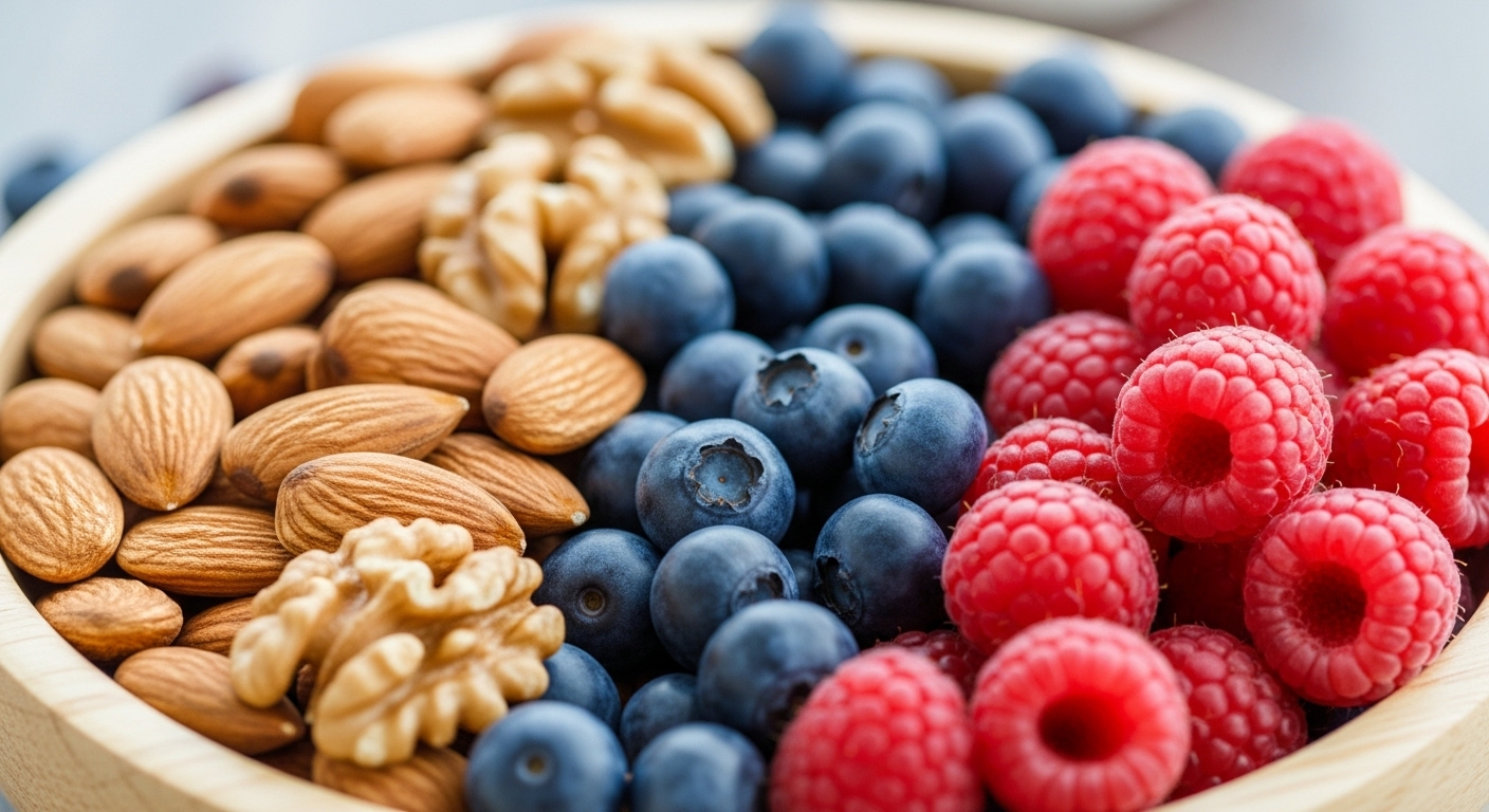 견과류는 비타민 E, 셀레늄, 그리고 건강한 불포화지방산이 풍부한 식품입니다. 이들은 강력한 항산화제로 작용하여 세포 손상을 막고, 암 발생 위험을 낮추는 데 기여합니다. 특히 아몬드에는 비타민 E가 많고, 호두에는 오메가-3가 풍부하니, 하루 한 줌씩 꾸준히 섭취하는 것이 좋습니다. 다만, 과도한 섭취는 칼로리가 높을 수 있으니 주의하세요.