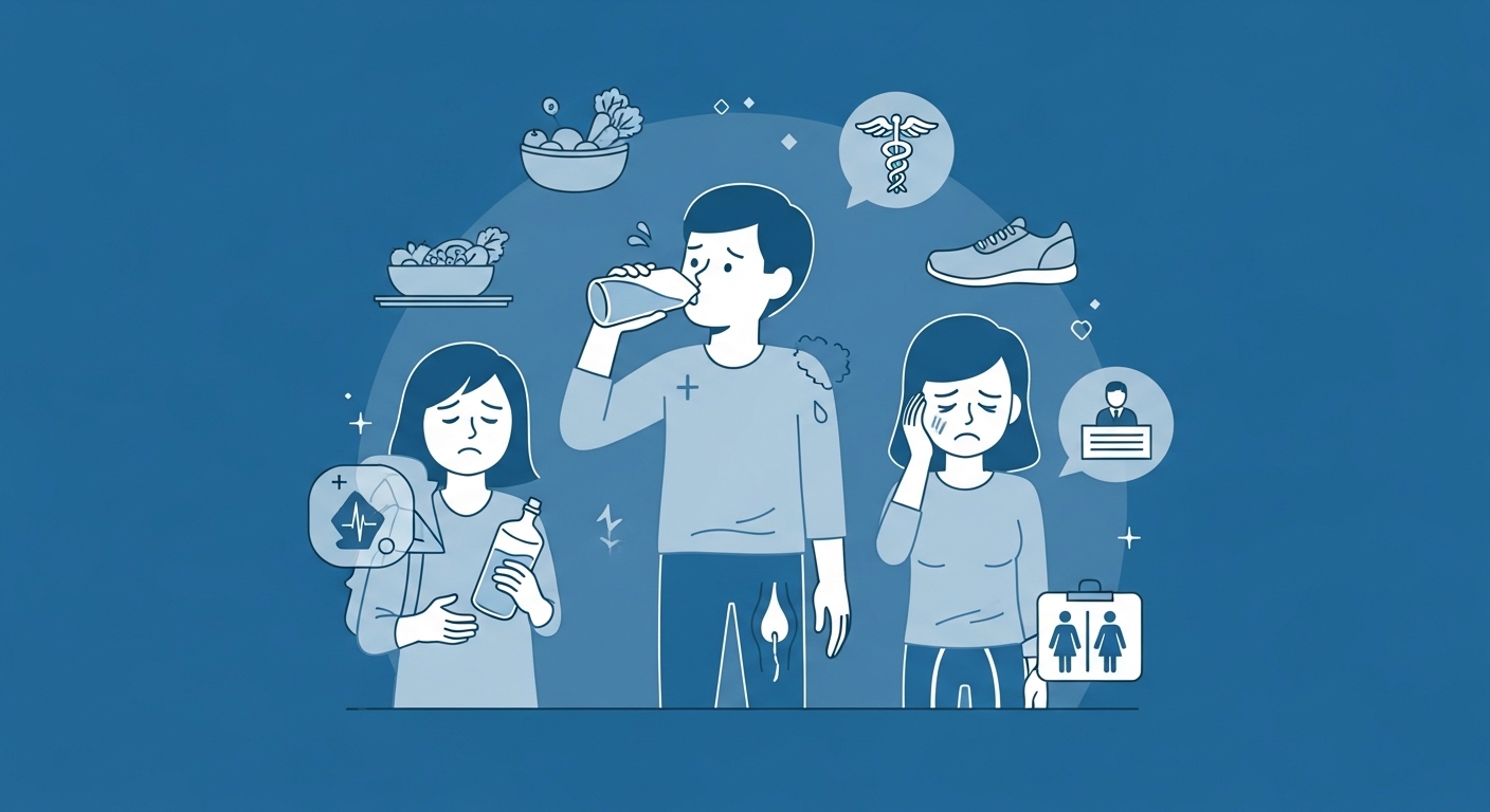 - 잦은 갈증 (다음)과 소변량 증가 (다뇨): 평소보다 물을 많이 마시게 되고, 화장실에 가는 횟수도 부쩍 늘었다면 의심해볼 수 있어요. 혈당이 높아지면 신장이 과부하되어 소변으로 당을 배출하려 하기 때문입니다.