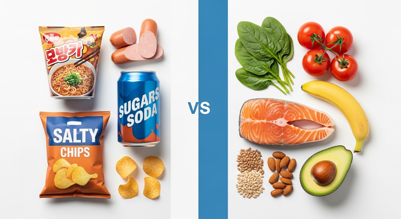 라면, 찌개, 인스턴트, 김치 등 고나트륨 음식은 혈압을 높여 심장에 부담을 줘요. 수분 불균형을 초래해 부정맥을 악화시킬 수 있죠. 특히 심방세동은 나트륨과 밀접! 저염식은 필수입니다.